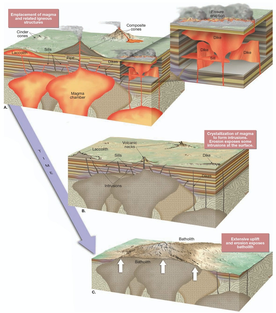 Figure 1.3. Formation of granitic rocks (taken from F. K. Lutgens, E. J. Tarbuck E.J. (2012) Essentials of Geology. 11th edition, Pearson Prentice Hall, New Jersey).