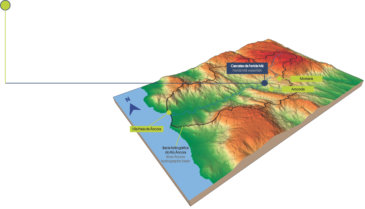 Ferida Má waterfall is 2.25 km long, between Montaria and Amonde, presents a high slope (7,6%), between 260 and 90 m of high, and is 15 m far from the coastline. Upstream, on the granite western flank of Arga Mountain, the slope is even more pronounced but downstream it becomes quite gentle.