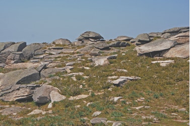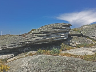 There are several types of granite landforms at the Arga Mountain top. They are the outcome of granite erosion caused by water and wind on the granite. Water reacts with minerals and promotes the break-up of the granite, especially near the fractures. Less fractured areas of the granite become prominent in the landscape giving rise to peculiar landforms such as the granite blocks that can be seen here.