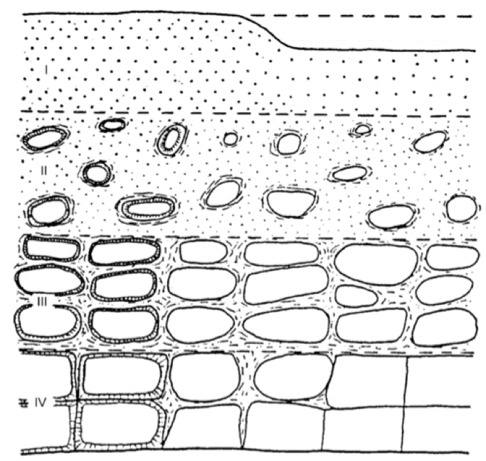Figure 4.10. Scheme representing a typical profile of weathering in granite rocks (Ruxton & Berry, 1957, in Migon, 2006, Granite Landscapes of the World, Oxford University Press): I – saprolite (< or = 30% of clay minerals, prevalence of quartz and kaolinite); II – saprolite, rounded “corestones” representing between 10% and 50%; III – prevalence of rectangular “corestones” surrounded by a weathered matrix; IV – more than 90 % of solid rock with only small amounts of weathered material in fractures.