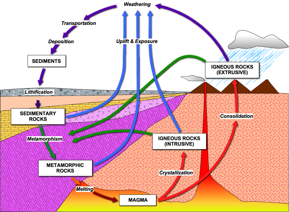 The rock cycle represents the main interactions between several processes and materials in the Earth system (Fig. 4.1), namely the origin of and the relation between igneous, sedimentary and metamorphic rocks. This model shows that any type of rock can be transformed into another due to geological processes.