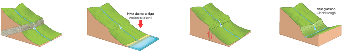 As quedas de água resultam de uma mudança brusca no declive do leito de um rio. Esta mudança pode ter diversas causas (ver figuras abaixo). As quedas de água podem ter diferentes formas e dimensões e, por isso, diversas designações: cascata, catarata, salto, bloco, entre outros.