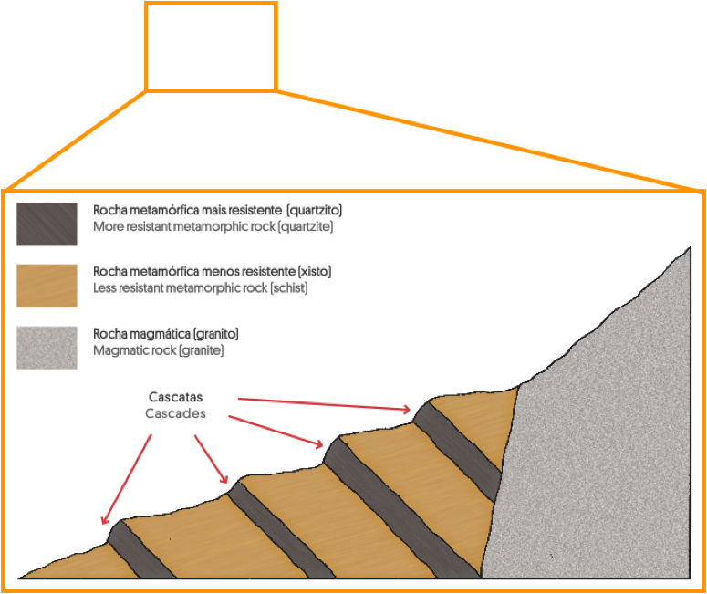 A alternância de rochas com diferente resistência à erosão provoca numerosos degraus com mais de 5 m.
