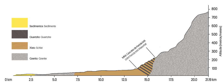 Perfil do rio Âncora e localização do Monumento Natural Cascata da Ferida Má