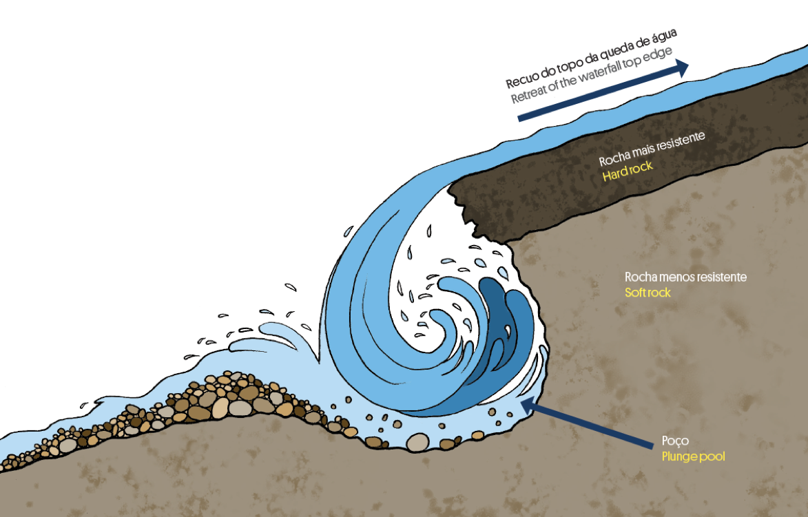 Nas cascatas, a erosão actua especialmente no topo e na base da queda de água. No topo da cascata, a acção erosiva da corrente pode provocar o recuo do seu bordo e a formação de uma zona de rápidos. Na base da cascata, a acção erosiva exercida pela pressão da água que cai escava “poços” que podem originar pequenos lagos.