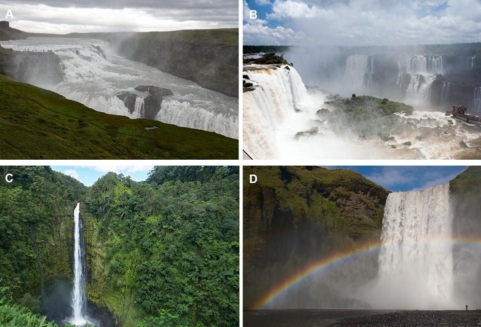 Figura 2.1. Exemplos de diferentes tipos de quedas de água: A - tipo cascata (Islândia); B - tipo catarata (Brasil/Argentina); C - tipo salto (Hawaii); D - tipo bloco (Islândia).