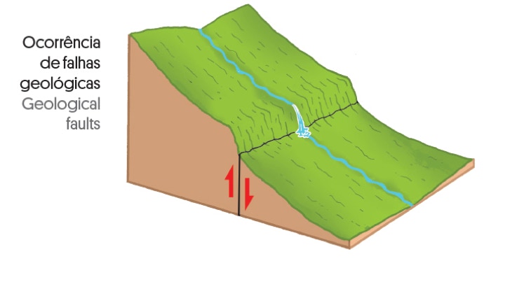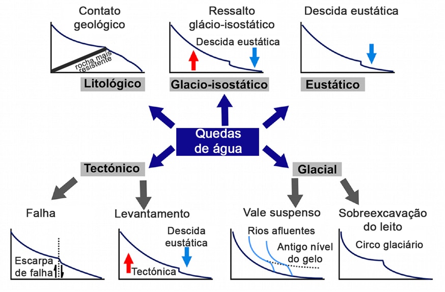 Existem dois mecanismos associados a atividade tectónica que favorecem a formação de quedas de água – o movimento ao longo de falhas e o soerguimento tectónico (Fig. 2.2). No caso de uma falha afetar o leito fluvial, ocorre na bacia hidrográfica uma mudança repentina no nível de base, originando a formação de uma queda de água (Fig. 2.6).