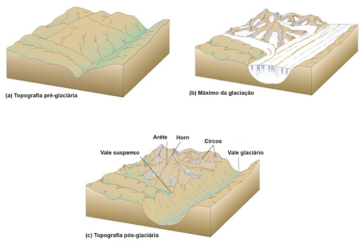 Nas áreas montanhosas modeladas pela erosão glaciária, observam-se com frequência fortes contrastes topográficos no leito do rio, assim como quedas de água. Estas quedas de água são formas herdadas de processos fluviais que resultam: i) da escavação diferencial do leito do rio por ação do gelo e dos sedimentos de fundo da língua glaciária; ou ii) da existência de vales suspensos (Fig. 2.3). Nestes últimos, a queda de água que se forma após o recuo ou desaparecimento do glaciar, resulta da menor capacidade de erosão de um vale tributário relativamente ao vale principal.