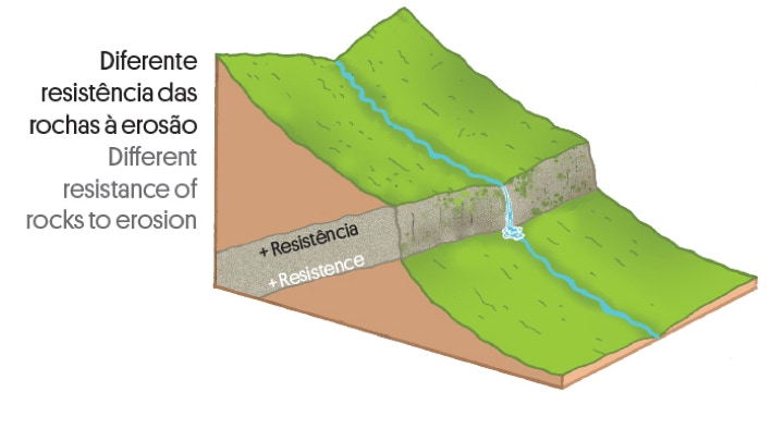 A litologia (tipo de rocha) e as estruturas que as afetam (e. g. falhas, diaclases) são uma componente da paisagem que está sujeita a erosão fluvial. A resistência à erosão é o principal fator que pode desencadear a formação de uma queda de água, estando relacionado com a erosão fluvial numa zona de contacto litológico. A erosão diferencial surge como resultado da resistência oferecida à erosão fluvial pelas rochas que constituem o leito do rio, com os materiais mais brandos a sofrer erosão mais rápida do que os mais resistentes.