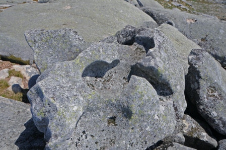 O aspeto mais marcante da morfologia granítica local é conferido pelo desenvolvimento de uma fraturação subhorizontal, conhecida por pseudo-estratificação (Fig. 3.4D). A pseudo-estratificação isola placas de rocha sobrepostas entre fraturas, apresentando, por vezes, uma abertura considerável. Estas características geomorfológicas, em especial a abertura nítida das fraturas subhorizontais, bem como o desenvolvimento dos pequenos alvéolos e a existência turfeiras, permitem considerar a evolução mais recente da paisagem em condições de clima periglaciário nos últimos 2.5 milhões de anos. Nos períodos mais frios, as variações térmicas sucessivas que originam ciclos de gelo e degelo, facilitaram a fraturação das rochas.