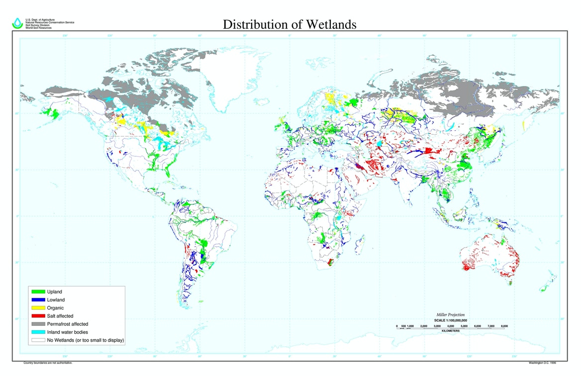Figura 3.7. Distribuição mundial das zonas húmidas do planeta em terras altas e em terras baixas; 60% são turfeiras (https://www.nrcs.usda.gov)