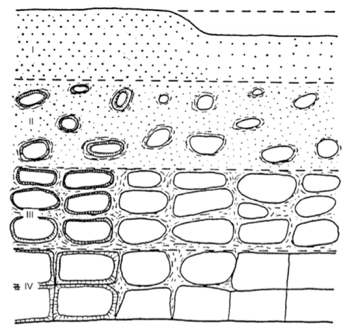 Figura 4.10. Representação esquemática de um perfil típico de alteração em rochas graníticas (Ruxton & Berry, 1957, in Migon, 2006, Granite Landscapes of the World, Oxford University Press): I – arena granítica, até 30% de argila, predomínio de quartzo e caulino; II – arena granítica, núcleos inalterados arredondados representam entre 10% e 50%; III – predomínio de núcleos inalterados retangulares envolvidos em matriz de alteração; IV – mais de 90 % de rocha sólida, material de alteração é residual na fraturas.