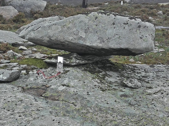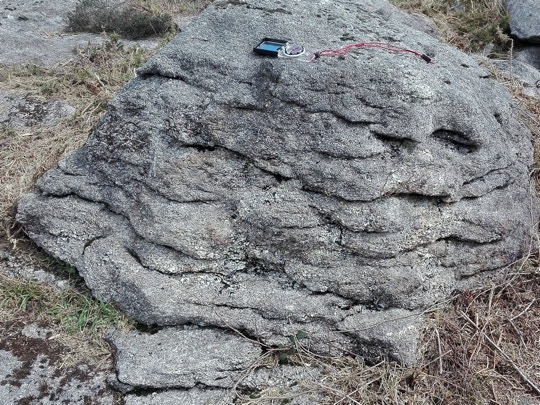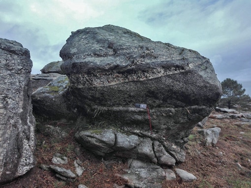Os blocos arredondados (bolas) são expostos à superfície à medida que o manto de alteração é erodido de modo diferencial e aí podem permanecer in situ ou sofrer algum transporte. As bolas graníticas continuam a sofrer os efeitos da meteorização química e física à superfície, podendo evoluir para esta forma já nesse contexto. No MNL, os blocos graníticos superficiais são pouco esféricos, predominando uma configuração irregular, associada a fracturação subhorizontal (Fig. 4.11).