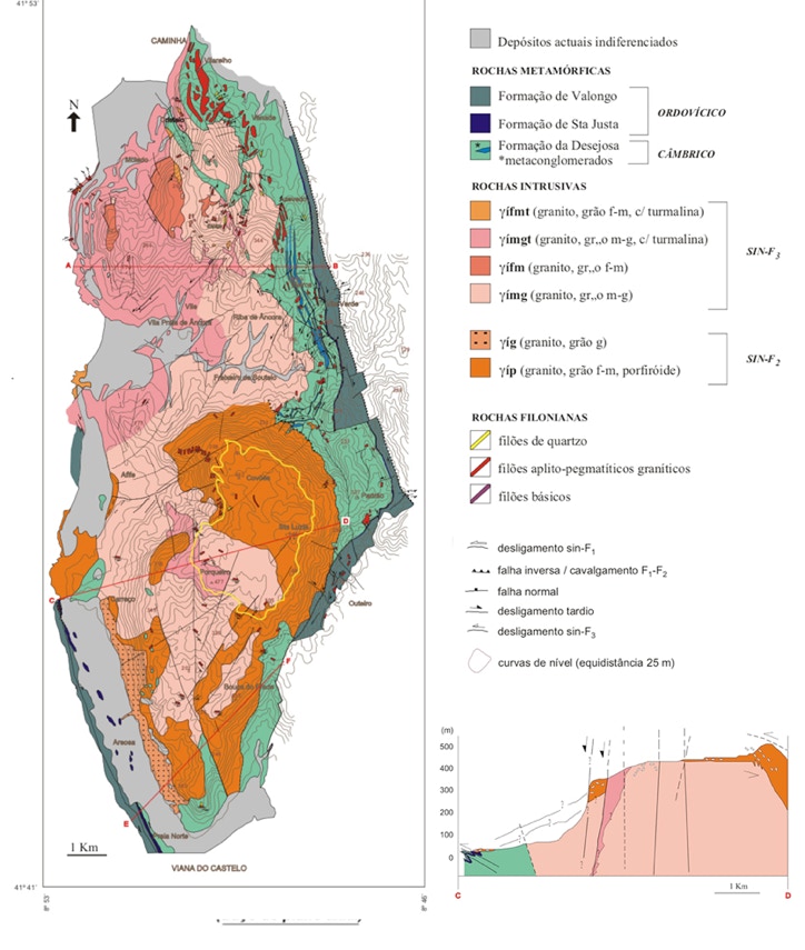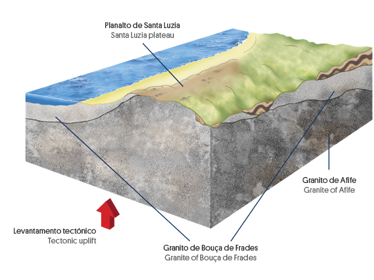 A disposição dos granitos está condicionada segundo a sua idade de instalação (na base, os granitos mais recentes da 3ª fase de deformação varisca e, por cima, os granitos mais antigos da 2ª fase), no contexto de um antiforme regional, denominado Antiforme Viana do Castelo – Caminha (AVCC) (Pamplona e Ribeiro, 2013, Evolução geodinâmica da região de Viana do Castelo (Zona Centro-Ibérica, NW de Portugal), In Geologia de Portugal, vol. 1, Escolar Editora, 149-203).