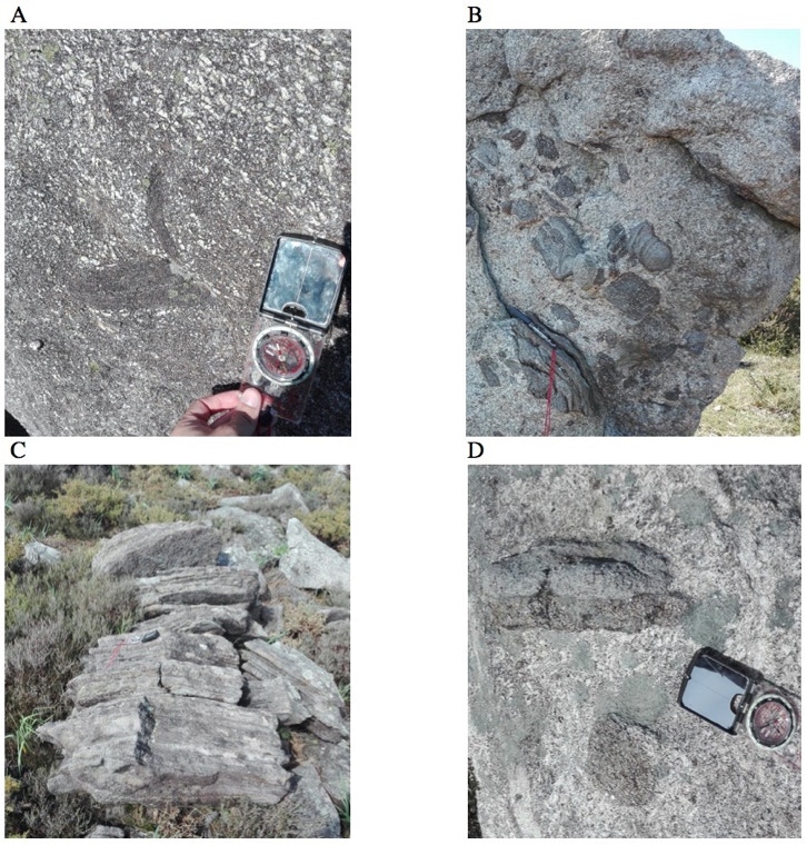 Figura 4.5. Ocorrência de encraves micáceos biotíticos (A) e metassedimentares (B) e afloramento de estruturas metassedimentares (C) na fácies porfiróide Granito de Bouça de Frades, no sector do vértice geodésico de Santa Luzia. Ocorrência de encraves da fácies Granito de Bouça de Frades na fácies Granito de Afife (D), no sector sudeste do MNL.