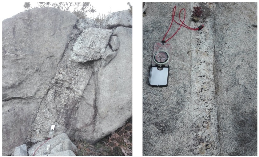 Figura 4.6. Filões pegmatíticos na fácies Granito de Afife, no sector sudeste do MNL, onde é possível observar presença de turmalina.