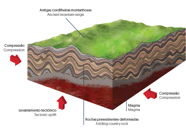 Os granitos que ocorrem no MNL e na região envolvente enquadram-se neste contexto orogénico varisco. A sua ocorrência atual à superfície evidencia uma erosão prolongada (nos últimos 300 Ma) das rochas do Maciço Ibérico, reforçada pelo levantamento tectónico regional ocorrido no âmbito da orogenia Alpina (Fig. 4.4).