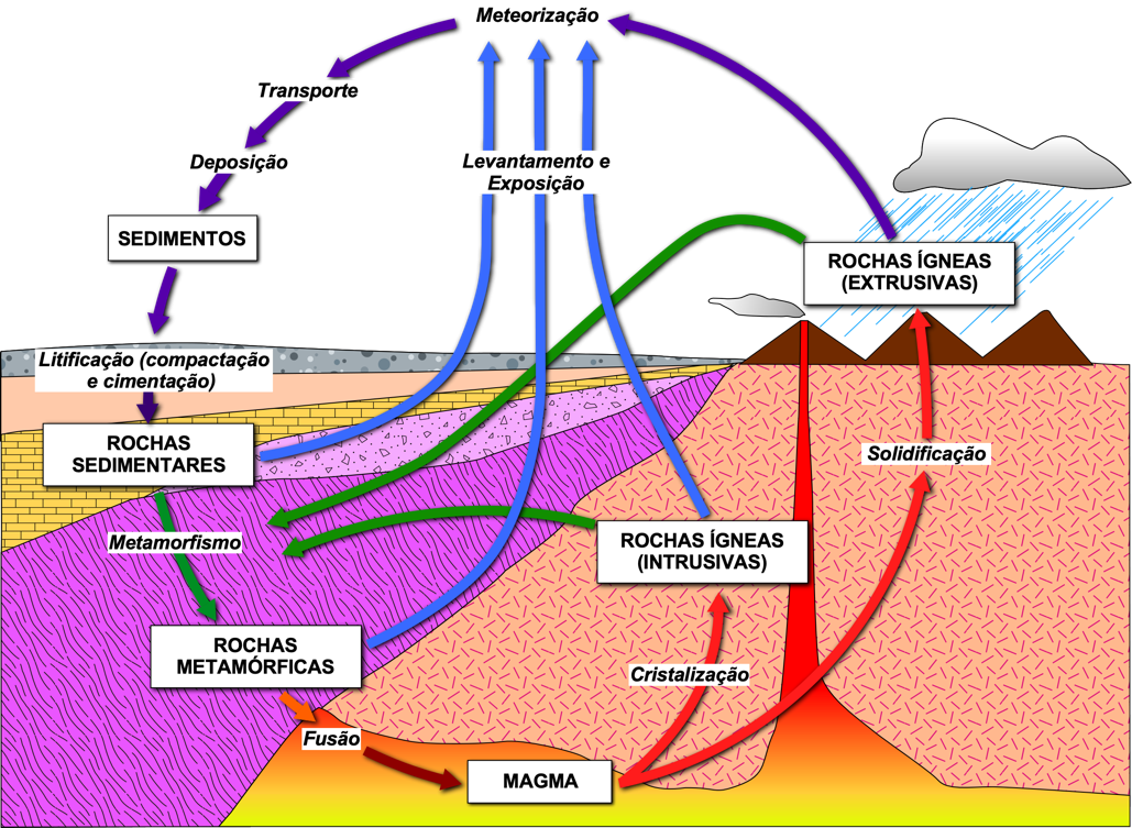 O ciclo das rochas representa as principais interações entre os numerosos materiais e processos do sistema Terra (Fig. 4.1), nomeadamente a origem das rochas ígneas, sedimentares e metamórficas e o modo como estas se relacionam. Este modelo evidencia que qualquer tipo de rocha pode ser transformado noutro por ação dos processos geológicos.