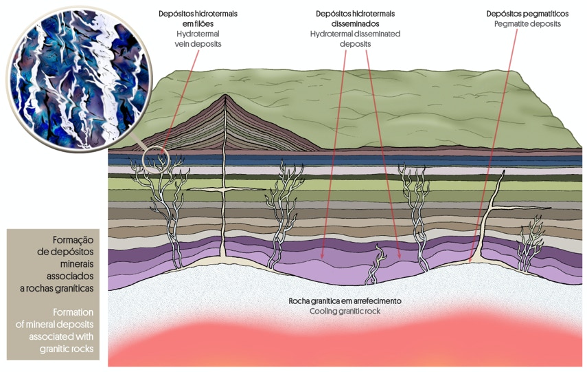 A origem dos depósitos minerais na área deste MNL é singenética, uma vez que está relacionada com o processo de formação das rochas magmáticas que nele ocorrem, nomeadamente com a circulação de fluidos hidrotermais em fraturas durante as fases finais de cristalização dessas rochas (Fig. 5.1).