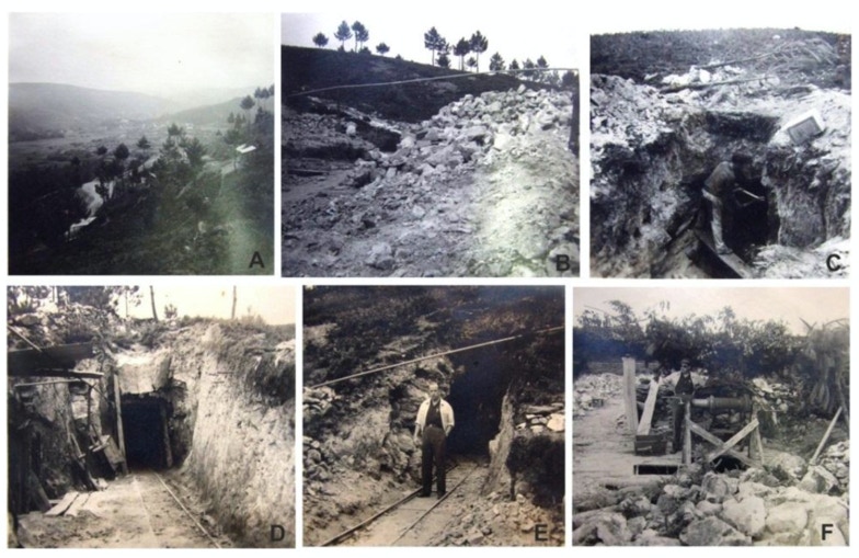 Figura 5.3. Fotografias dos trabalhos de pesquisa da mina do Alto da Bouça da Breia, 1957: A – Aspecto geral da região e instalações mineiras; B – Escombreira; C – Poço; D – Galeria em filão pegmatítico; E – Galeria do filão pegmatítico; F – Poço sobre o filão de Au (Dossier 3146, RRM, 1957) (Arquivo da Direção Geral de Energia e Geologia).
