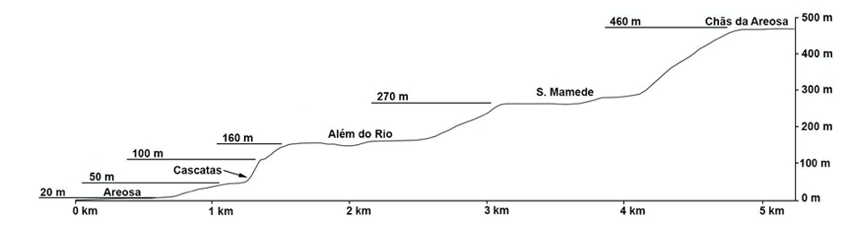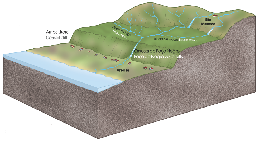 As cascatas localizam-se no troço mais encaixado da ribeira, troço que faz a ligação entre as antigas superfícies de erosão, hoje mais elevadas (acima de 100 metros), com a plataforma litoral mais recente que se desenvolve abaixo de 60 metros (Figs. 6.3 a 6.5).