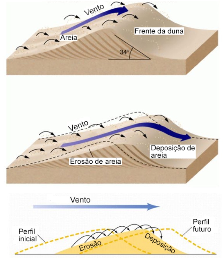 O transporte dos sedimentos conduz à formação de elevações, mais ou menos rítmicas, constituídas por duas faces. A face da elevação, de frente para o vento (face a barlavento) tem menor inclinação, sendo a face contrária (face a sotavento) mais inclinada. A crista da duna separa as suas duas faces. Na face a barlavento ocorre erosão e mobilização dos sedimentos, enquanto na face a sotavento ocorre a sua deposição. Esta ação continuada resulta no movimento, ou migração, da duna no sentido a favor do vento. Esta migração mantém-se enquanto houver condições, nomeadamente a ação do vento, a disponibilidade de sedimentos e a ausência de obstáculos que impeçam o transporte dos sedimentos.
